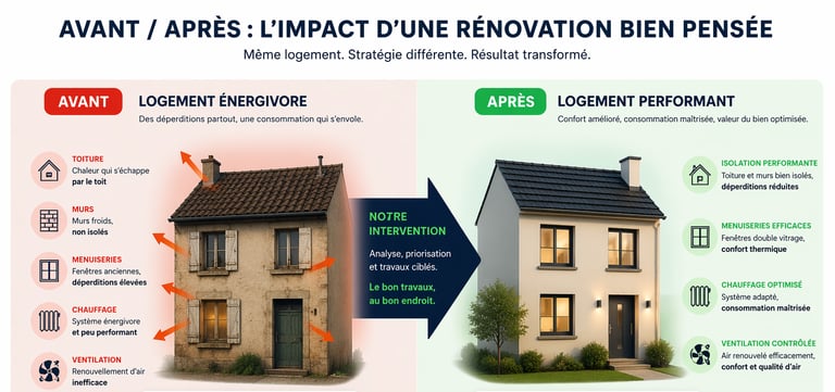 nous analysons les postes de déperdition dominants et identifions les leviers techniques les plus efficaces pour améliorer la classe énergétique.